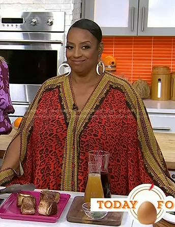 on Today on NBC was spotted wearing this red leopard print caftan on Today on Nov 15 2023's episode. 's Caftan is the Valencia Goddess Kaftan by by Sai Sankoh.