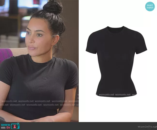 Kim Kardashian (played by Kim Kardashian) on The Kardashians on Hulu was spotted wearing this black tee on The Kardashians on episode 'Not Forgotten, Not Forgiven' (4x08) in Nov 2023. Kim's Top is the Cotton Jersey T-Shirt by Skims.