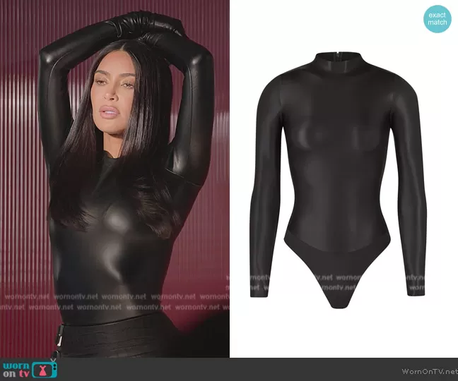 Kim Kardashian (played by Kim Kardashian) on The Kardashians on Hulu was spotted wearing this black leather bodysuit on The Kardashians on episode 'Not Forgotten, Not Forgiven' (4x08) in Nov 2023. Kim's Bodysuit is the Mock Neck Bodysuit by Skims.
