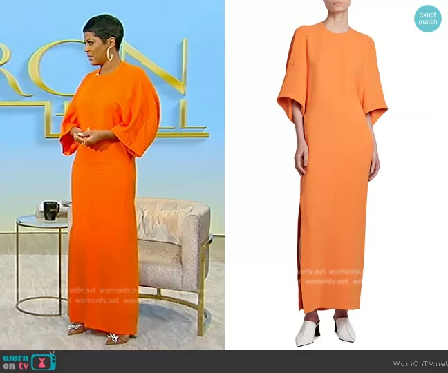 Tamron Hall on Tamron Hall Show on ABC was spotted wearing this orange maxi dress on Tamron Hall Show on Nov 16 2023's episode. Tamron's Dress is the Cape Maxi Dress by Stella McCartney.
