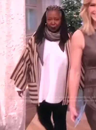 Whoopi Goldberg on The View on ABC was spotted wearing this striped jacket on The View on Nov 16 2023's episode. Whoopi's Jacket is the Dali Striped Open Jacket by Fortela.