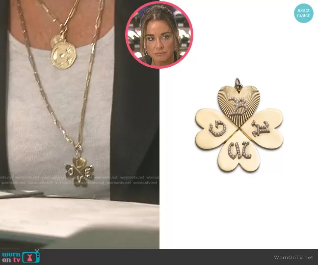Kyle Richards on The Real Housewives of Beverly Hills on Bravo was spotted wearing this gold clover pendant on The Real Housewives of Beverly Hills on episode 'Hellevator' (13x04) in Nov 2023. Kyle's Necklace is the Custom Four Heart Clover Oversized Medallion by Foundrae . Kyle's Shoes is the Bouncing Sneaker in Black / White by Hermes.