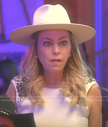 Sutton Stracke on The Real Housewives of Beverly Hills on Bravo was spotted wearing this white embellished sleeveless top on The Real Housewives of Beverly Hills on episode 'Hellevator' (13x04) in Nov 2023. Sutton's Top is the Jewel-Neck Embellished Shell by Monique Lhuillier.