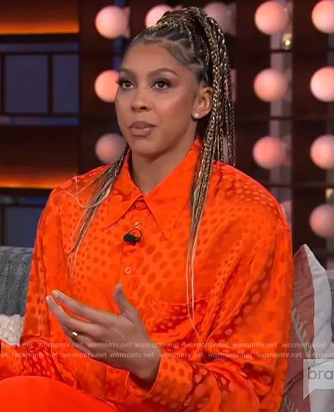 on The Kelly Clarkson Show on NBC was spotted wearing this orange polka dot print shirt on The Kelly Clarkson Show on Nov 17 2023's episode. 's Top is the Dotted Stripe Jacquard Oversized Shirt by Christopher John Rogers.