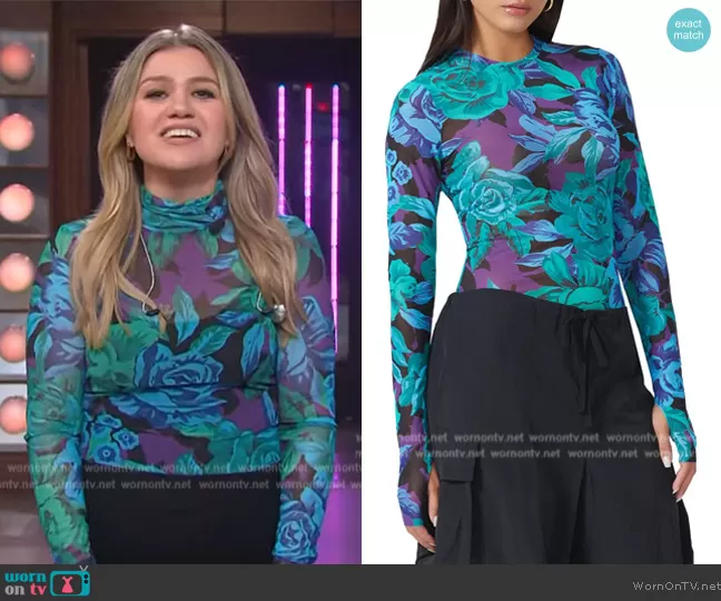 Kelly Clarkson on The Kelly Clarkson Show on NBC was spotted wearing this blue floral mesh top on The Kelly Clarkson Show on Nov 17 2023's episode. Kelly's Top is the Kaylee Crewneck Mesh Top by AFRM.