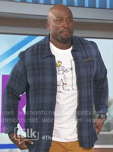 Akbar Gbajabiamila on The Talk on CBS was spotted wearing this blue plaid overshirt on The Talk on Nov 17 2023's episode. Akbar's Jacket is the Robbins Plaid Zip-Up Shirt Jacket by John Varvatos . Akbar's Shoes is the Air Jordan 1 Mid SE Taupe Haze sneakers by Nike.