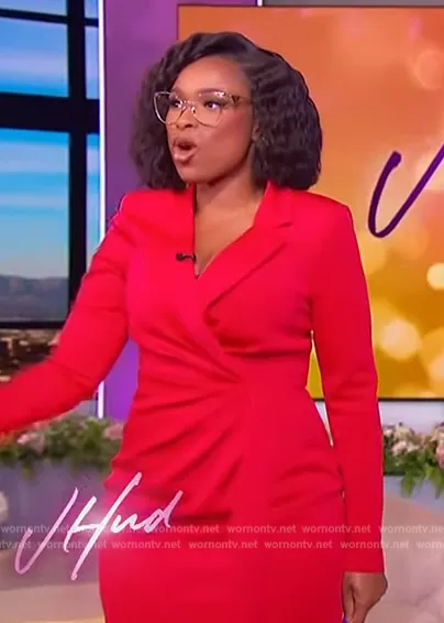 Jennifer Hudson on The Jennifer Hudson Show on FOX was spotted wearing this red belted wrap dress on The Jennifer Hudson Show on Nov 17 2023's episode. Jennifer's Dress is the Pleated Draped Midi Blazer Dress by Badgley Mischka.