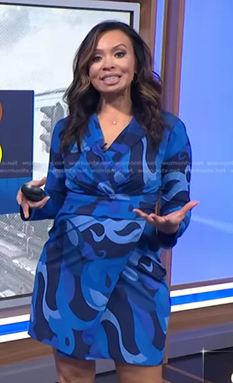 Adelle Caballero on Today on NBC was spotted wearing this blue printed wrap dress on Today on Nov 17 2023's episode. Adelle's Dress is the Blazer Wrap Dress by Donna Morgan.
