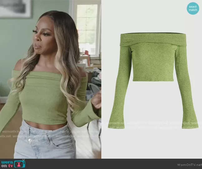 Candiace Dillard Bassett on The Real Housewives of Potomac on Bravo was spotted wearing this green off shoulder sweater and jeans on The Real Housewives of Potomac on episode 'Home Sweet Drama' (8x02) in Nov 2023. Candiace's Sweater is the Solid Off Shoulder Crop Top by Cider . Candiace's Pants is the Criss Cross Upsized Jean by Agolde.