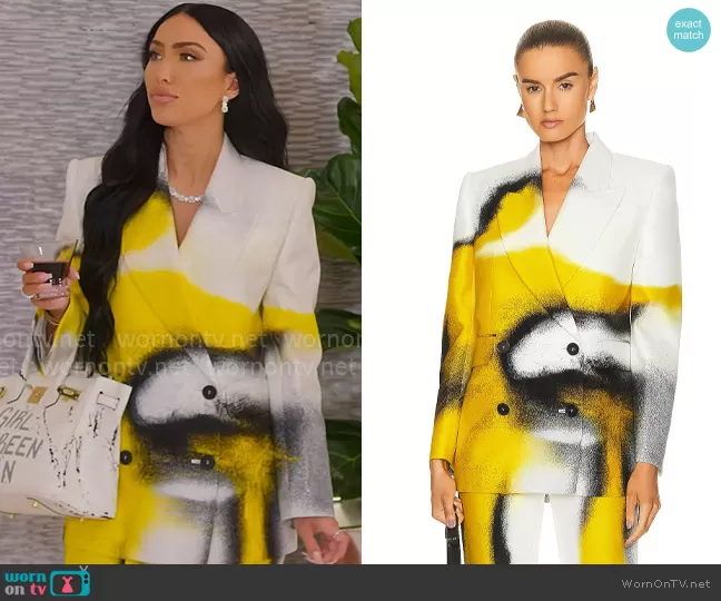 Bre Tiesi on Selling Sunset on Netflix was spotted wearing this spray paint print suit on Selling Sunset on episode 'Pack it up, pack it in' (7x10) in Nov 2023. Bre's Jacket is the Double Breasted Boxy Jacket in White and Acid Yellow by Alexander McQueen . Bre's Pants is the High Waisted Trouser in White and Acid Yellow by Alexander McQueen . Bre's Bag is the #GYBAF Bag by Sonique Saturday.
