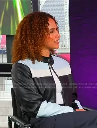 on Good Morning America on ABC was spotted wearing this black colorblock leather jacket on Good Morning America on Nov 17 2023's episode. 's Jacket is the Cropped Colorblock Biker Jacket by Maeve.
