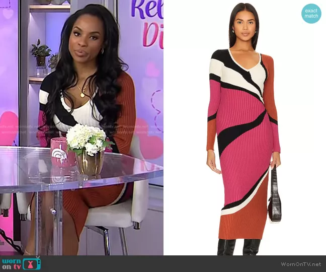 on Today on NBC was spotted wearing this pink colorblock ribbed dress on Today on Nov 17 2023's episode. 's Dress is the Lorna Knit Midi Dress by MinkPink.