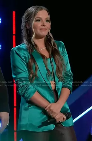 on The Voice on NBC was spotted wearing this green cropped top and blazer on The Voice on Nov 14 2023's episode. 's Top is the Satin Nikki Top in Blue Jade by Cinq a Sept . 's Jacket is the Satin Kylie Blazer in Blue Jade by Cinq a Sept.