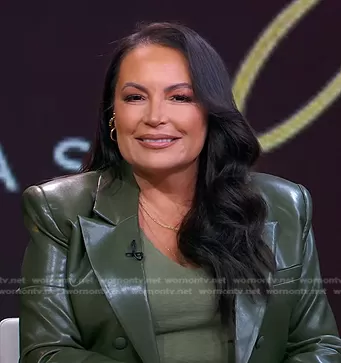 on Good Morning America on ABC was spotted wearing this green cropped leather blazer on Good Morning America on Nov 20 2023's episode. 's Jacket is the Anthony Cropped Faux Leather Blazer by Alice + Olivia.