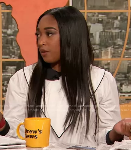 Drew Barrymore on The Drew Barrymore Show on CBS was spotted wearing this white contrast dress on The Drew Barrymore Show on Nov 18 2023's episode. Drew's Dress is the Penelope embellished cotton-poplin mini dress by Batsheva.