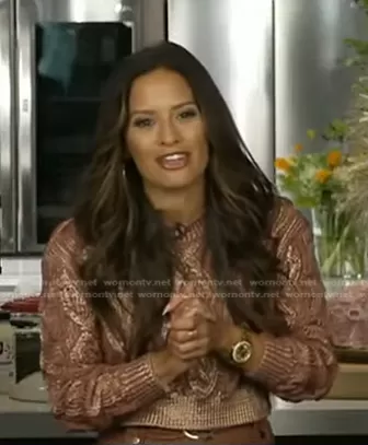 on Good Morning America on ABC was spotted wearing this metallic cable knit sweater on Good Morning America on Nov 21 2023's episode. 's Sweater is the Cable Knit Sweater by Zara.