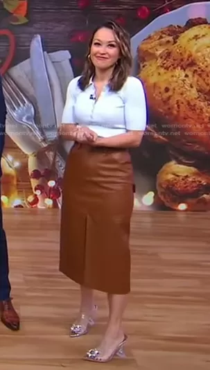 Eva Pilgrim on Good Morning America on ABC was spotted wearing this light blue polo and brown leather skirt on Good Morning America on Nov 21 2023's episode. Eva's Top is the Atlas Ribbed Top in Chelsea Blue by A.L.C. . Eva's Skirt is the Alden Skirt by A.L.C..