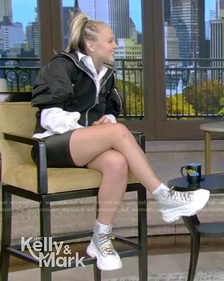 on Live with Kelly and Mark on Disney ABC Home Entertainment was spotted wearing this crystal embellished platform sneakers on Live with Kelly and Mark on Nov 20 2023's episode. 's Shoes is the Crystal-Embellished Leather Tread Slick Boots by Alexander McQueen.