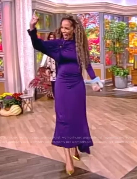 Sunny Hostin on The View on ABC was spotted wearing this purple ring cutout dress on The View on Nov 22 2023's episode. Sunny's Dress is the Asymmetric cutout gathered glossed-jersey dress by Victoria Beckham.