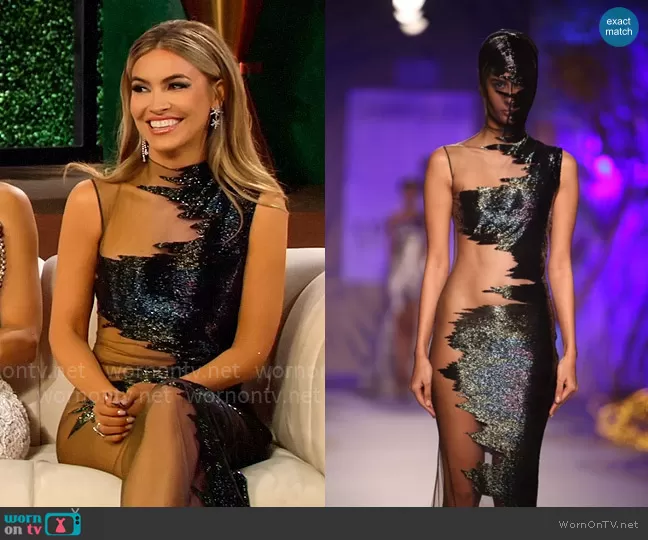 Chrishell Stause on Selling Sunset on Netflix was spotted wearing this reunion dress on Selling Sunset on episode 'Reunion' (7x12) in Nov 2023. Chrishell's Dress is the 2013 Couture Collection by Gaurav Gupta . Chrishell's Earrings is the Star Strass Earrings by Maje . Chrishell's Styling is the Elizabeth Meredith.