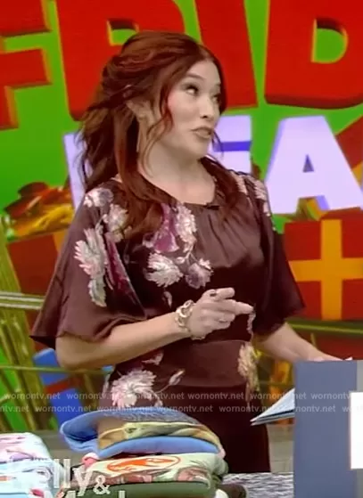 on Live with Kelly and Mark on Disney ABC Home Entertainment was spotted wearing this maroon floral print dress on Live with Kelly and Mark on Nov 23 2023's episode. 's Dress is the Simone Fleur Floral Short Sleeve Silk Dress by Rebecca Taylor.