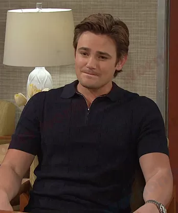 Johnny DiMera (played by Carson Boatman) on Days of our Lives on Peacock was spotted wearing this navy textured zip polo shirt on Days of our Lives on Nov 24 2023's episode. Johnny's Shirt is the Groove Half Zip Textured Polo T-Shirt by Reiss.