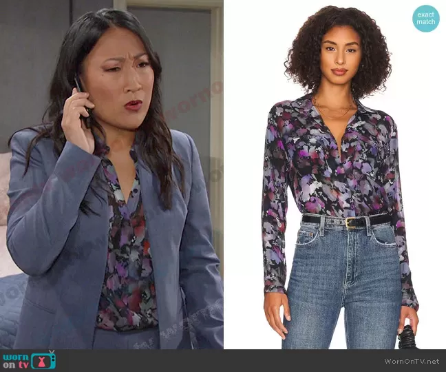 Melinda Trask (played by Tina Huang) on Days of our Lives on Peacock was spotted wearing this floral blouse and blue suit on Days of our Lives on Nov 24 2023's episode. Melinda's Top is the Full Button Down Hipster Shirt in Evening Floral by Bella Dahl . Melinda's Jacket is the Tori Wool-Blend Jacket by Elie Tahari . Melinda's Pants is the Karis Front-Seam Ankle Pants by Elie Tahari . Melinda's Bag is the Paige Tote Bag in Stone by Bcbgmaxazria.