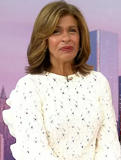 Hoda Kotb on Today on NBC was spotted wearing this white open knit ruffle sweater on Today on Nov 24 2023's episode. Hoda's Sweater is the Ivory Puff Sleeve Cable Knit Sweater by Carolina Herrera.