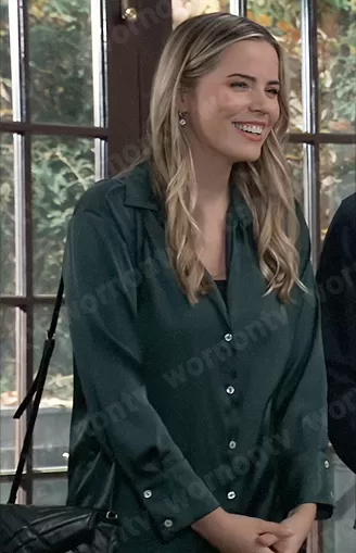 For the Thanksgiving celebrations on General Hospital, Sasha's fashion choice stood out for its understated elegance and her fondness for a particular style – so much so that she owned it in two colors. She opted for a Flowy Satin Effect Shirt by Zara, selecting it in both a deep bottle green and a beautiful blue. This decision to purchase the same shirt in different colors underscored her appreciation for its simple yet sophisticated design. The bottle green version, with its rich hue and satin texture, added a festive and elegant flair to her Thanksgiving look. The shirt's classic button-down style, coupled with its luxurious feel, highlighted Sasha's preference for timeless pieces that marry comfort with chic aesthetics. This sartorial choice not only showcased her character's stylish sensibility but also a practical approach to fashion, choosing versatile pieces that can be worn on multiple occasions and in various settings.