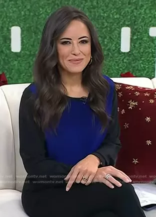Kaylee Hartung on Today on NBC was spotted wearing this blue and black colorblock blouse on Today on Nov 27 2023's episode. Kaylee's Top is the Louisa Silk Top by Diane von Furstenberg.
