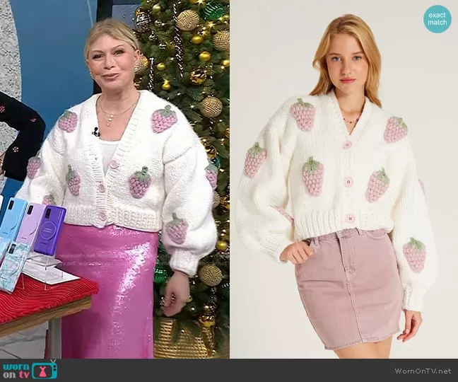 Jill Martin on Today on NBC was spotted wearing this white strawberry cardigan and sequin skirt on Today on Nov 27 2023's episode. Jill's Sweater is the Pink Strawberry White Cardigan by Society Mano . Jill's Skirt is the Cadena Midi Skirt by LoveShackFancy.