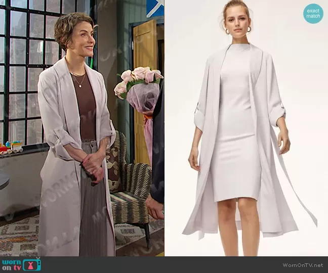 Sarah Horton (played by Linsey Godfrey) on Days of our Lives on Peacock was spotted wearing this pale pink long jacket on Days of our Lives on May 17 2024's episode. Sarah's Jacket is the New Kahlo Robe by Babaton at Aritzia . Sarah's Bag is the Huasteca Leather Shoulder Bag by All Saints.