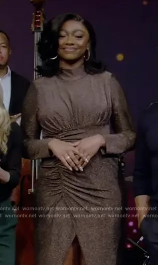 on Live with Kelly and Mark on Disney ABC Home Entertainment was spotted wearing this metallic ruched dress on Live with Kelly and Mark on Nov 28 2023's episode. 's Dress is the Brown Shimmer Gown by Aidan Aidan Mattox.