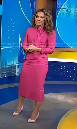 Ginger Zee on Good Morning America on ABC was spotted wearing this pink tie neck dress on Good Morning America on Nov 28 2023's episode. Ginger's Dress is the Kosi Dress with Sleeves Pink by Lady Biba.