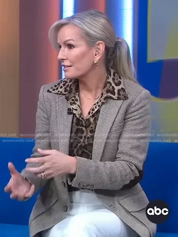 Dr. Jennifer Ashton on Good Morning America on ABC was spotted wearing this leopard blouse and herringbone blazer on Good Morning America on Feb 29 2024's episode. Jennifer's Top is the Leopard-Print Shirt by Dolce & Gabbana . Jennifer's Jacket is the Herringbone Blazer by Ralph Lauren .
