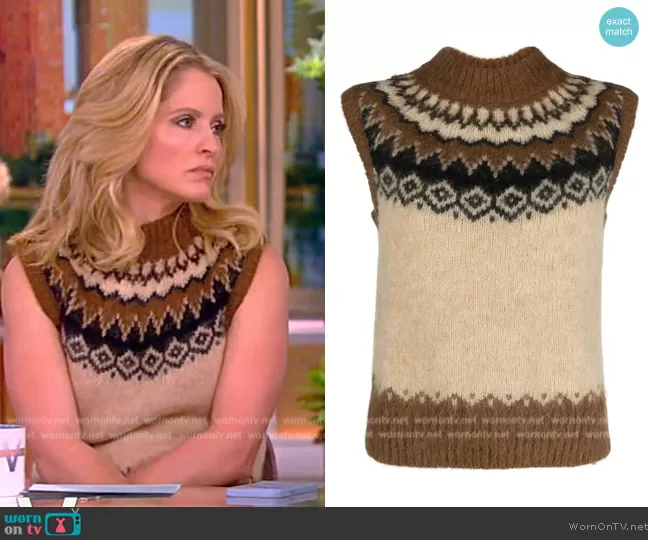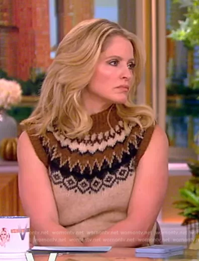 Sara Haines on The View on ABC was spotted wearing this fairisle vest on The View on Nov 28 2023's episode. Sara's Vest is the Fairisle Wool-Blend Sweater Vest by Ralph Lauren.