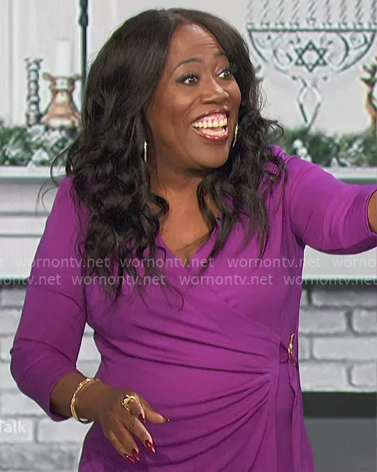 Sheryl Underwood on The Talk on CBS was spotted wearing this purple wrap top on The Talk on Nov 28 2023's episode. Sheryl's Top is the Faux-Wrap Jersey Top by LAUREN Ralph Lauren.