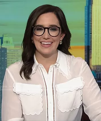 Savannah Sellers on NBC News Daily on NBC was spotted wearing this white scalloped pocket blouse on NBC News Now on Nov 28 2023's episode. Savannah's Top is the scalloped Point Collar Silk Shirt by Claudie Pierlot.