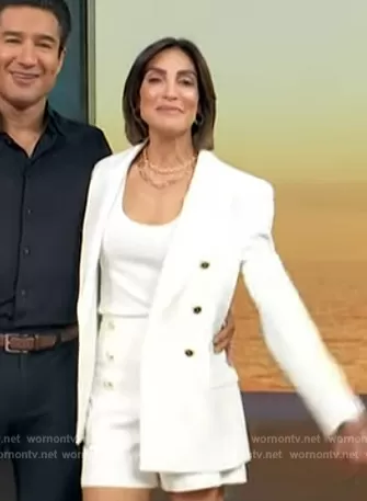 on Access Hollywood on NBC was spotted wearing this white double breasted blazer on Access Hollywood on Nov 28 2023's episode. 's Blazer is the Tailored Double Breasted Blazer by Zara . 's Shorts is the Bermuda Shorts with Gold Buttons by Zara.