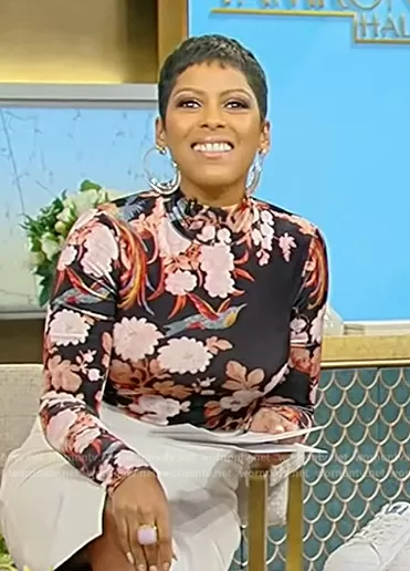 Tamron Hall on Tamron Hall Show on ABC was spotted wearing this black floral print turtleneck top on Tamron Hall Show on Nov 29 2023's episode. Tamron's Top is the Suzie Floral Print Mock Neck Top by Cara Cara . Tamron's Shoes is the Suede Pumps by Giuseppe Zanotti.