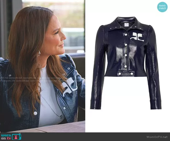 Meredith Marks on The Real Housewives of Salt Lake City on Bravo was spotted wearing this navy cropped jacket and pants on The Real Housewives of Salt Lake City on episode 'Icy Apologies' (4x12) in Nov 2023. Meredith's Jacket is the Textured Vinyl Crop Jacket in Navy by Courreges . Meredith's Pants is the Vinyl 5-Pocket Iconic Pants by Courreges.
