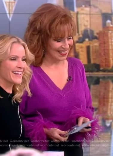 Joy Behar on The View on ABC was spotted wearing this purple metallic feather cuff sweater on The View on Nov 29 2023's episode. Joy's Sweater is the Metallic Feather Cuff V-Neck Sweater by Milly.