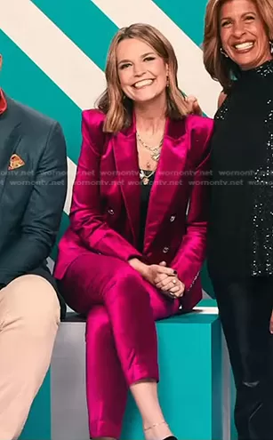 Savannah Guthrie on Today on NBC was spotted wearing this fuchsia velvet suit on Today Family Holiday Card on Nov 29 2023's episode. Savannah's Jacket is the Elam Velvet Dickey Jacket in Fuchsia by Veronica Beard . Savannah's Pants is the Honolulu Velvet Pant in Fuchsia by Veronica Beard.