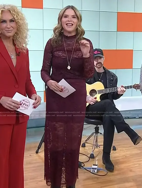 Jenna Bush Hager on Today on NBC was spotted wearing this brown lace top and skirt on Today on Jan 28 2025's episode. Jenna's Top is the The Pia Top in Plum by Hill House Home . Jenna's Skirt is the The Olympia Skirt by Hill House Home.