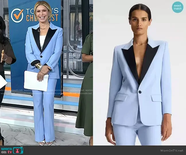 Jill Martin on Today on NBC was spotted wearing this blue contrast collar blazer and pants on Today on Mar 05 2025's episode. Jill's Jacket is the Davin II Tuxedo Jacket in skylark/black by A.L.C. . Jill's Pants is the Sophie II Pant in skylark/black by A.L.C. . Jill's Shoes is the Clarita Leather Sandals by Alexandre Birman.