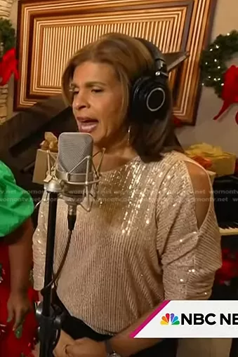 Hoda Kotb on Today on NBC was spotted wearing this sequin cutout shoulder top on Today on Nov 29 2023's episode. Hoda's Top is the Cold Shoulder Sequin Top in Champagne by JASAMBAC at Amazon.