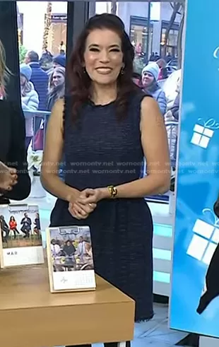 on Today on NBC was spotted wearing this Amy E. Goodman’s navy sleeveless tweed dress on Today on Nov 29 2023's episode. 's Dress is the Rainbow Tweed Dress by Rebecca Taylor.