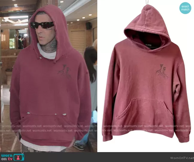 (played by Travis Barker) on The Kardashians on Hulu was spotted wearing this red hoodie on The Kardashians on episode 'Buckle Up and Let's Go' (4x10) in Nov 2023. 's Sweater is the Virginia Creeper Hoodie by Raf Simons.