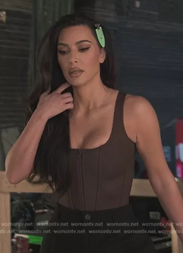 Kim Kardashian (played by Kim Kardashian) on The Kardashians on Hulu was spotted wearing this brown corset on The Kardashians on episode 'Buckle Up and Let's Go' (4x10) in Nov 2023. Kim's Top is the Zipped spandex corset top by Balenciaga.