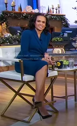 Linsey Davis on Good Morning America on ABC was spotted wearing this blue surplice knit dress on Good Morning America on Nov 30 2023's episode. Linsey's Dress is the Cashmere Shawl Collar Wrap Sweater Dress in Sea Strom by Ann Taylor.